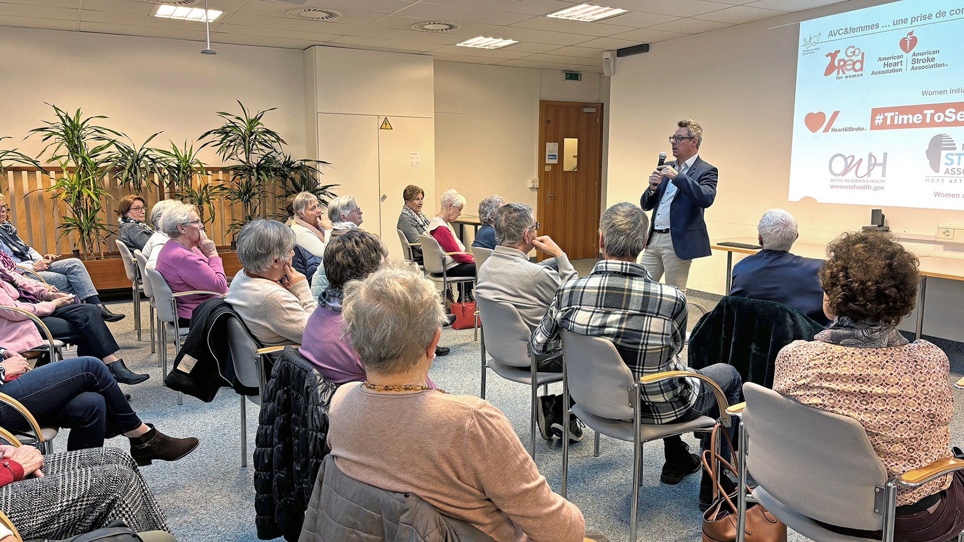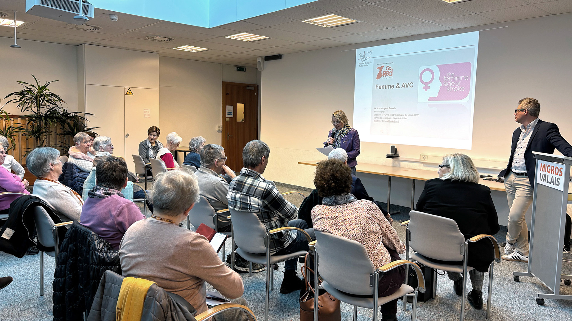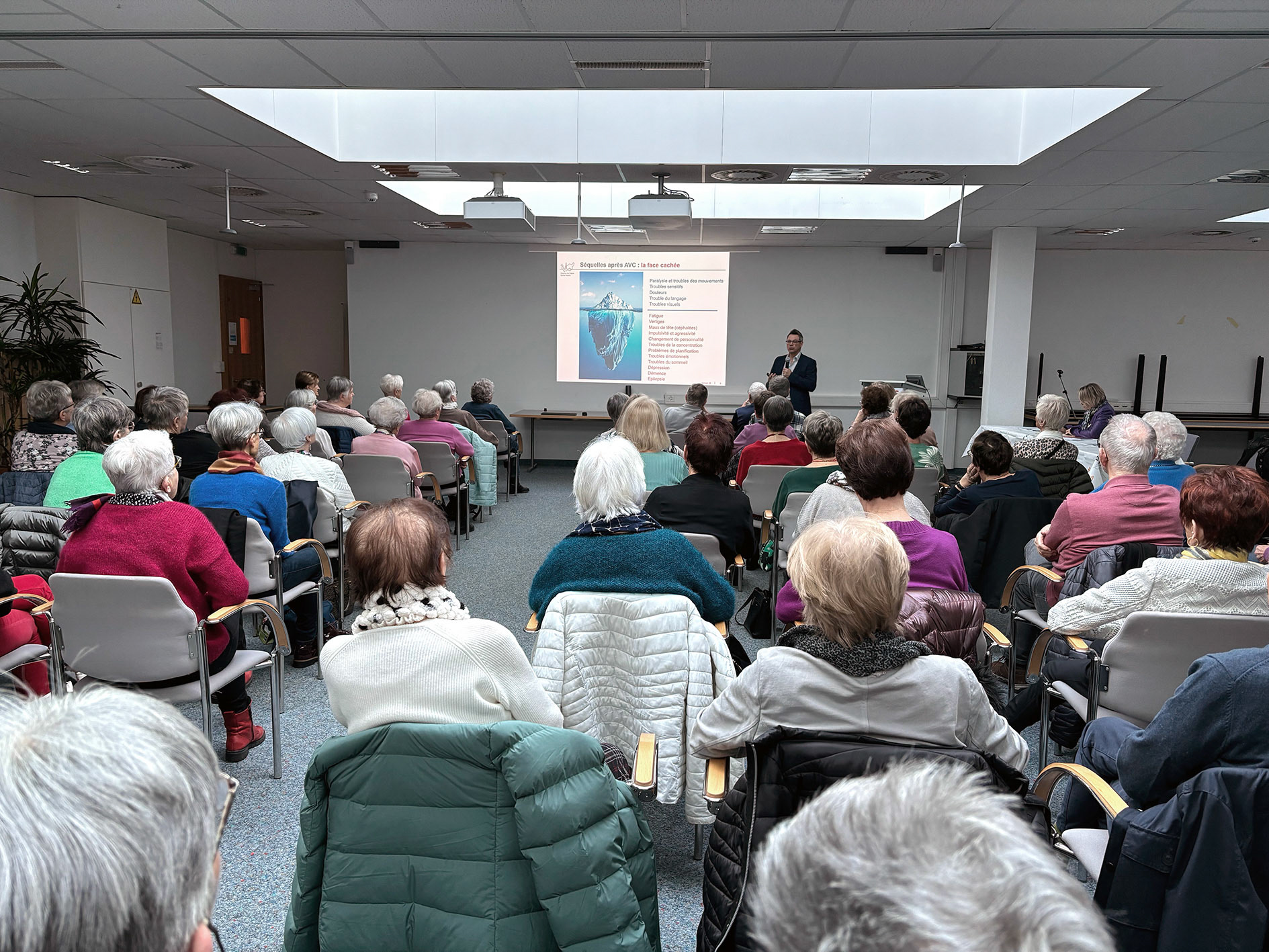 23 janvier 2025 - Conférence du Dr Christophe Bonvin, médecin chef du service de neurologie à l'Hôpital de Sion, sur les facteurs de risques d'un AVC et les moyens de les contrôler. Photos ©Alice Zuber - Tableaux Hôpital du Valais